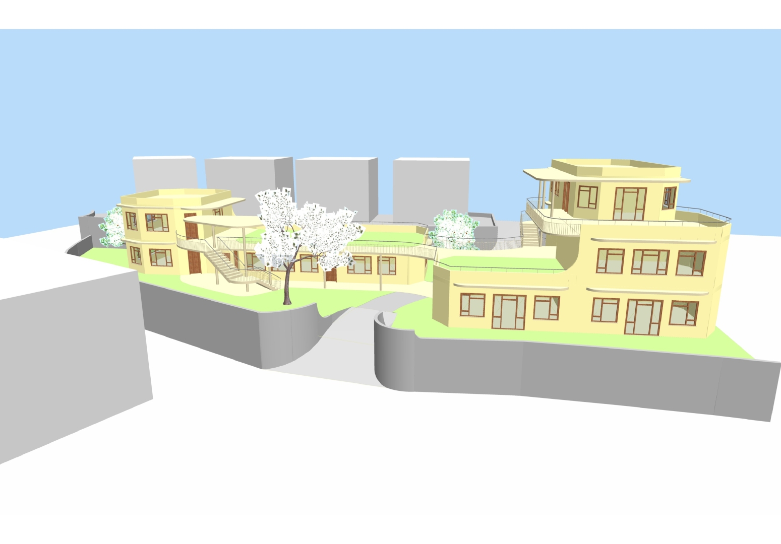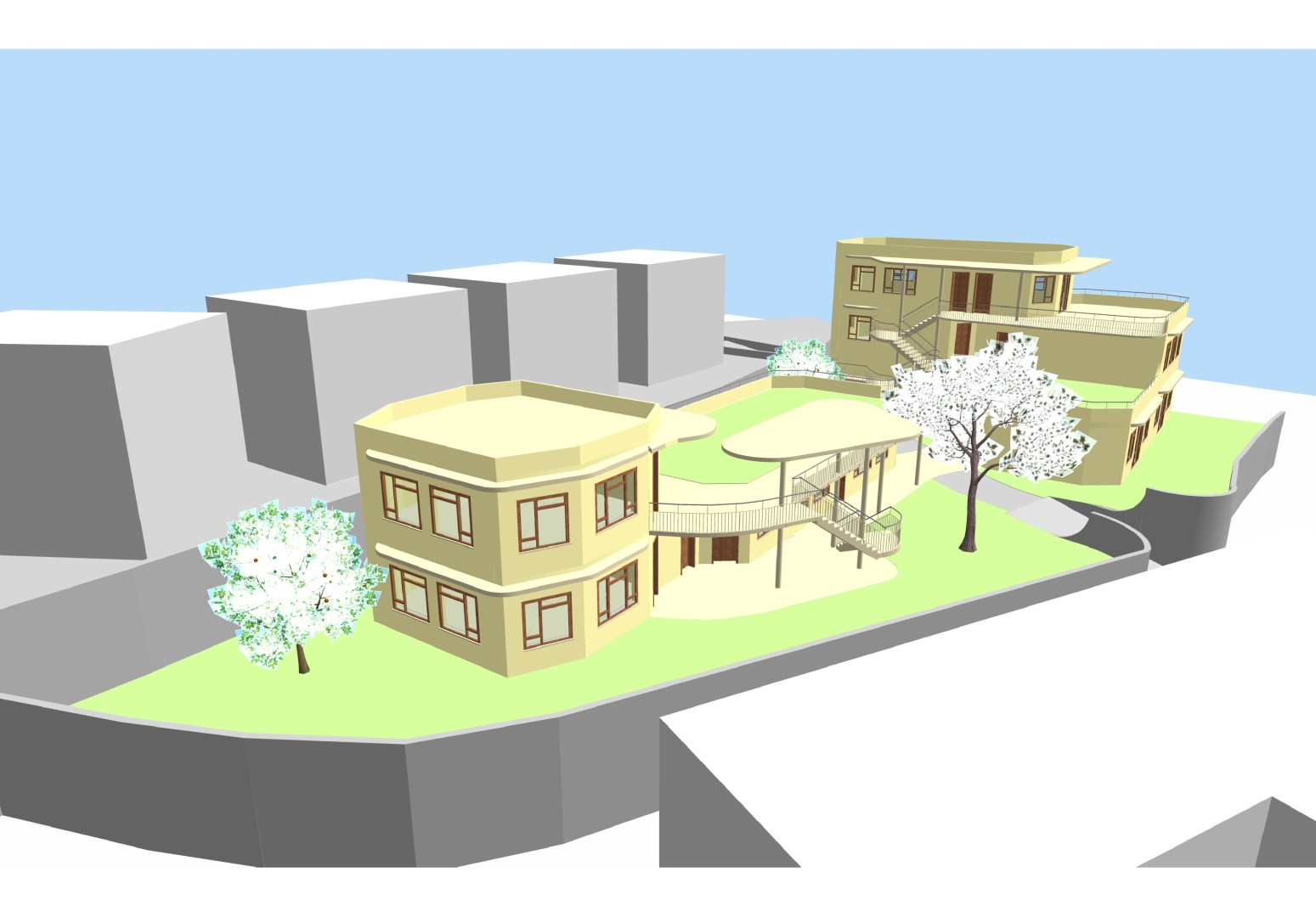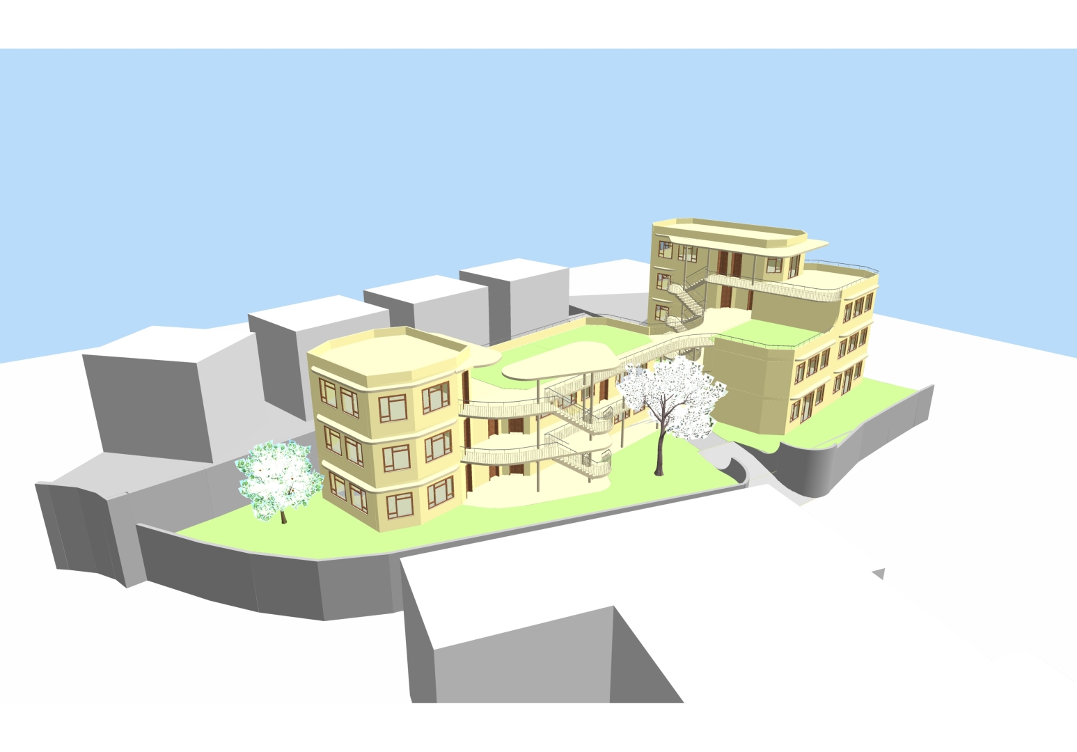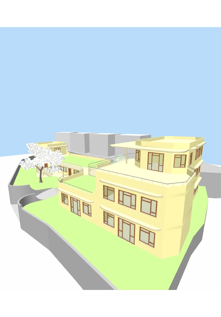 Statt das bestehende Gebäude zu erweitern und zu erhöhen, was erhebliche statische Probleme mit sich gebracht hätte, schlug ich einen Neubau für die Schule vor. Das bestehende Gebäude sollte dann als Wohnheim umgebaut werden.