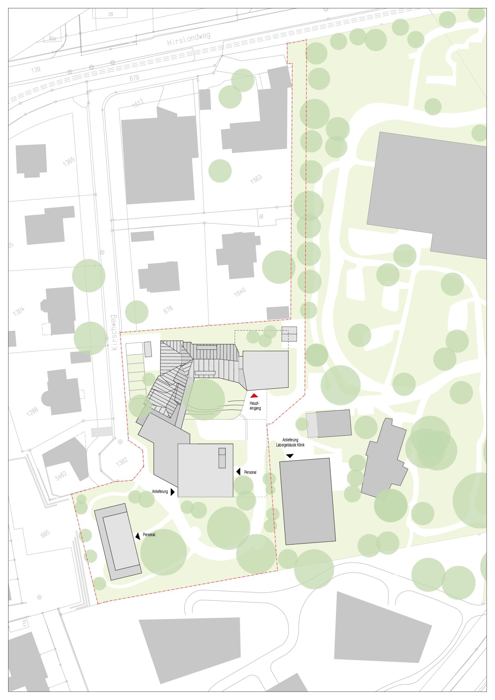 Gebäude und Freiräume werden so aufeinander abgestimmt, dass sie sich gegenseitig aufwerten. Insbesondere wird das neue Laborgebäude der Klinik in die räumliche Komposition aufgenommen. Für den von der Gemeinde Arlesheim definierten Perimeter für die gemeinsame Aussenraumgestaltung wurden gemeinsame Ziele bezüglich Erschliessung, Pflanzkonzept, Sichtbeziehungen, Bodenbeläge etc. erarbeitet.