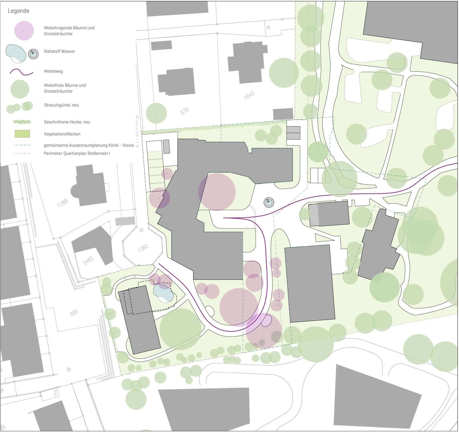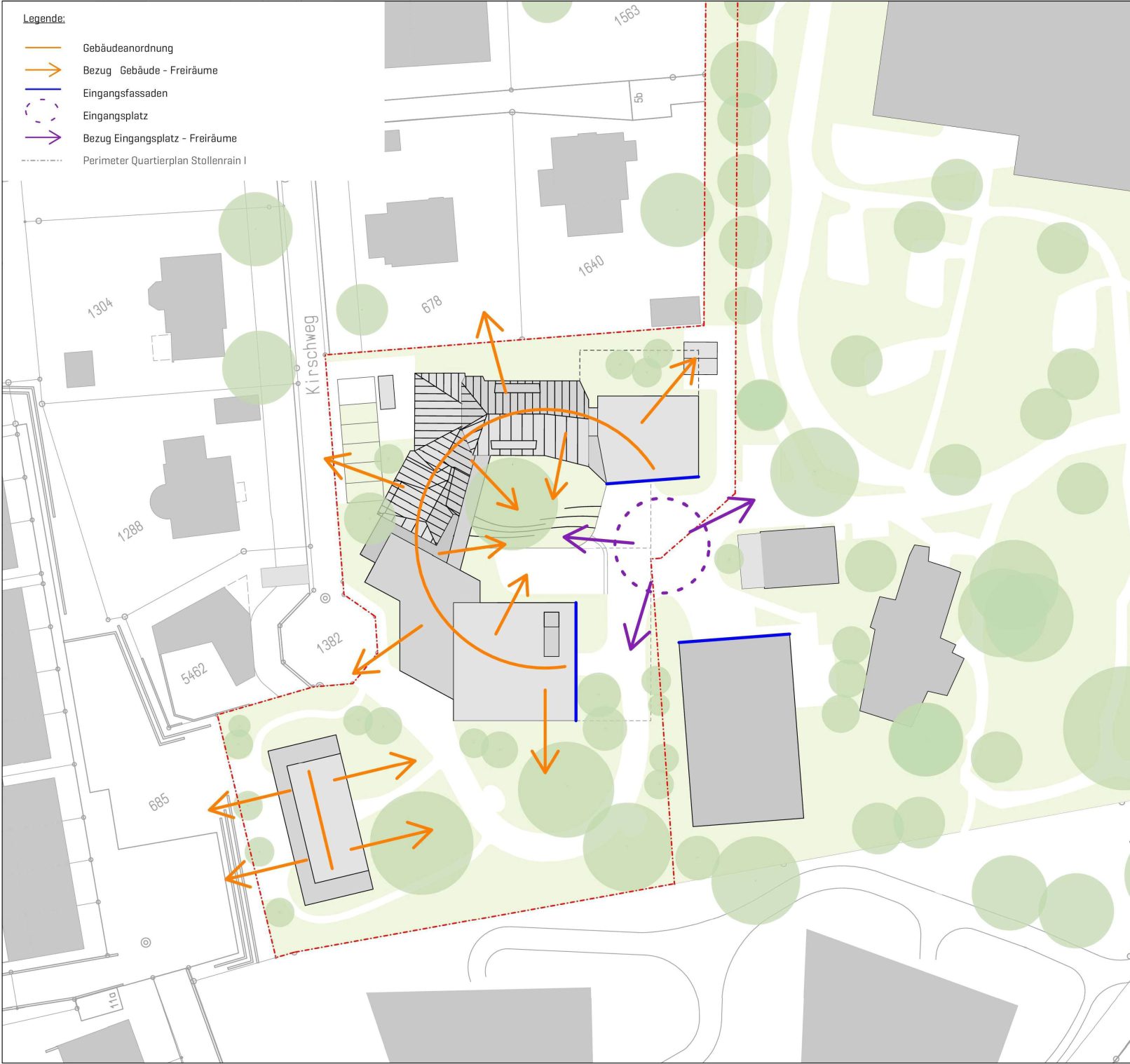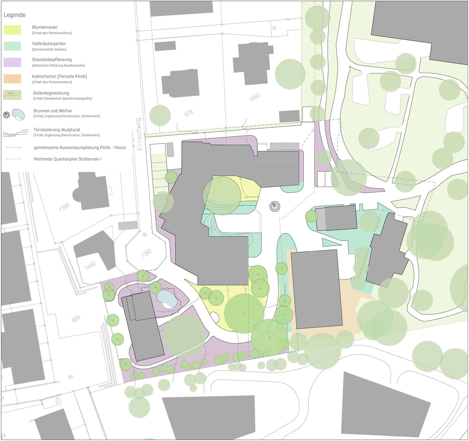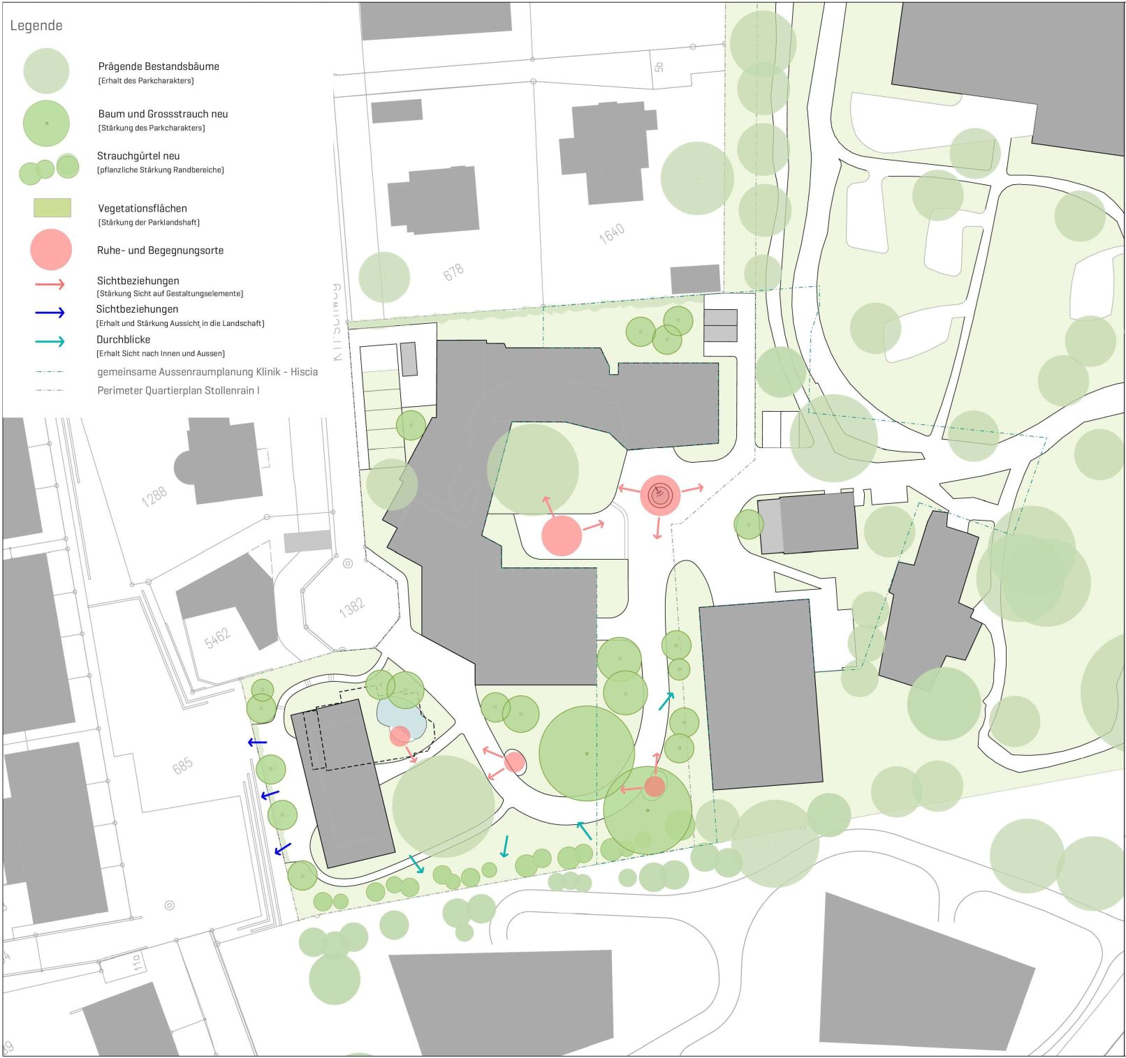 Die Leitziele aus dem Grün- und Freiraumkonzept Stollenrain werden der Aussenraumplanung zugrunde gelegt. Diese beinhalten: