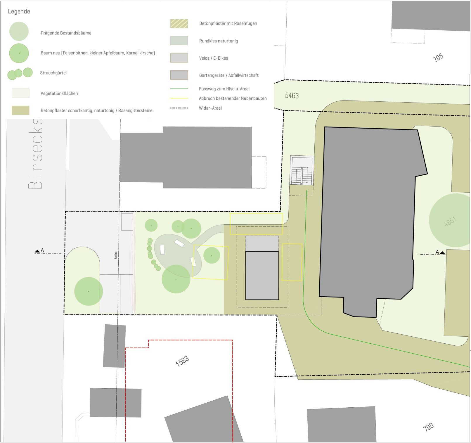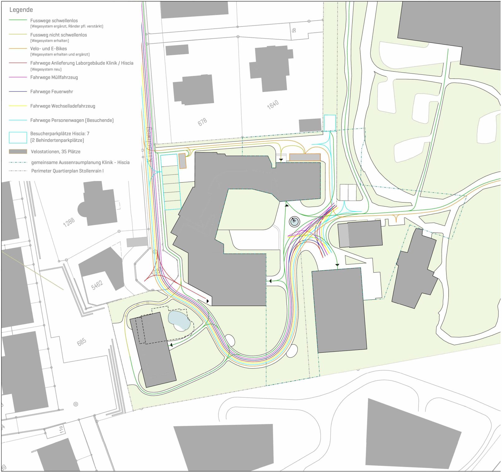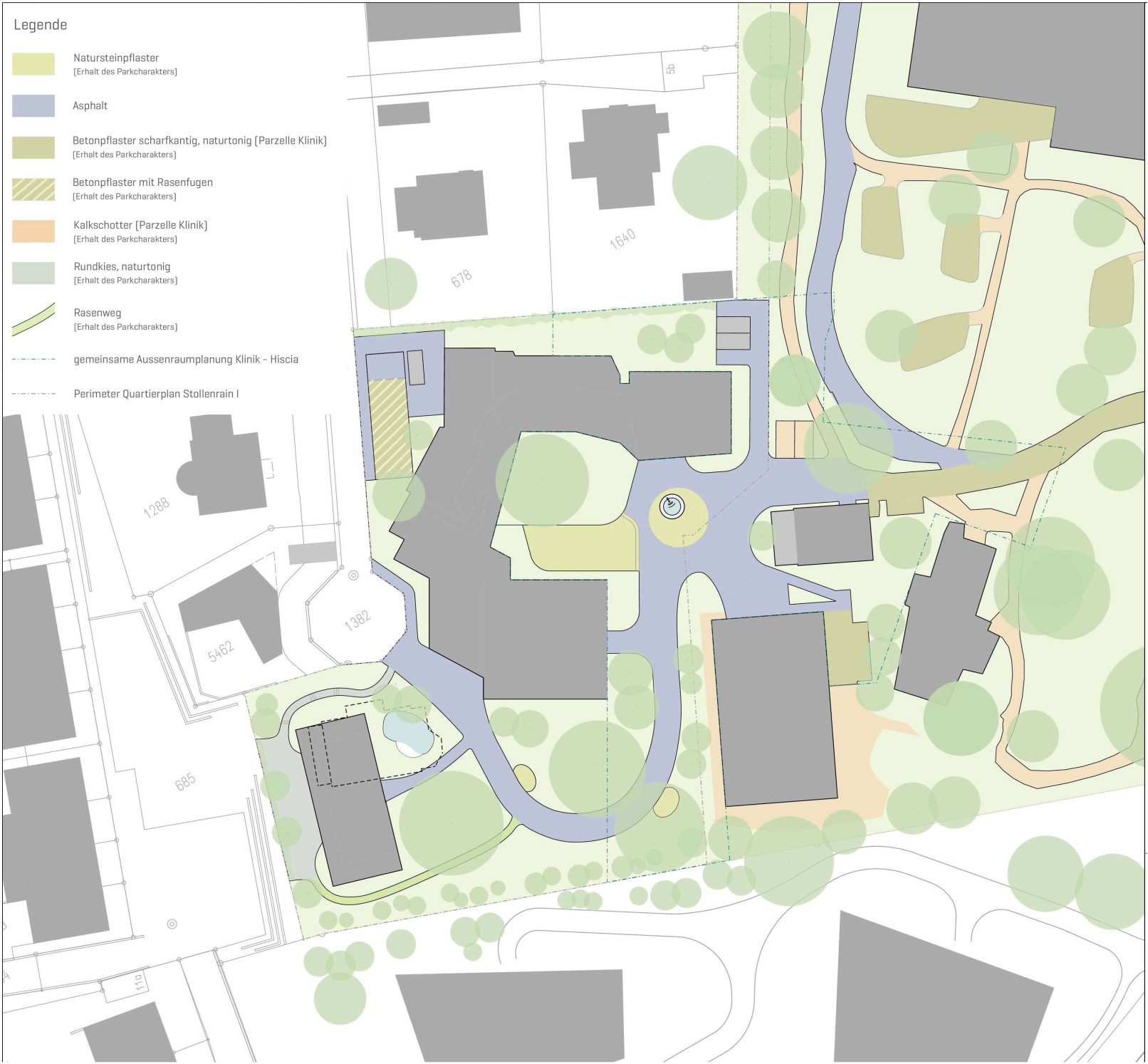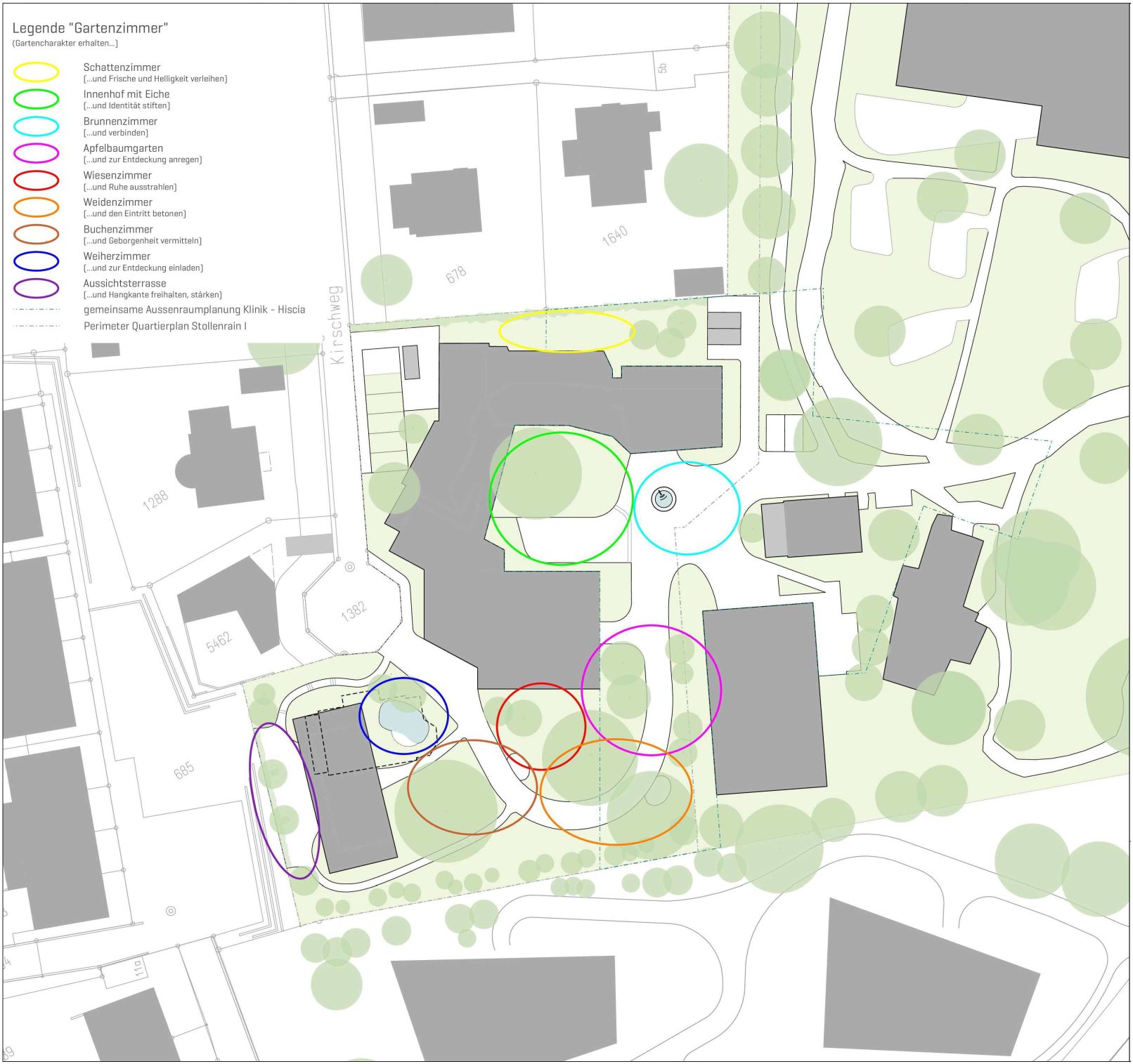 Die Leitziele aus dem Grün- und Freiraumkonzept Stollenrain werden der Aussenraumplanung zugrunde gelegt. Diese beinhalten:
