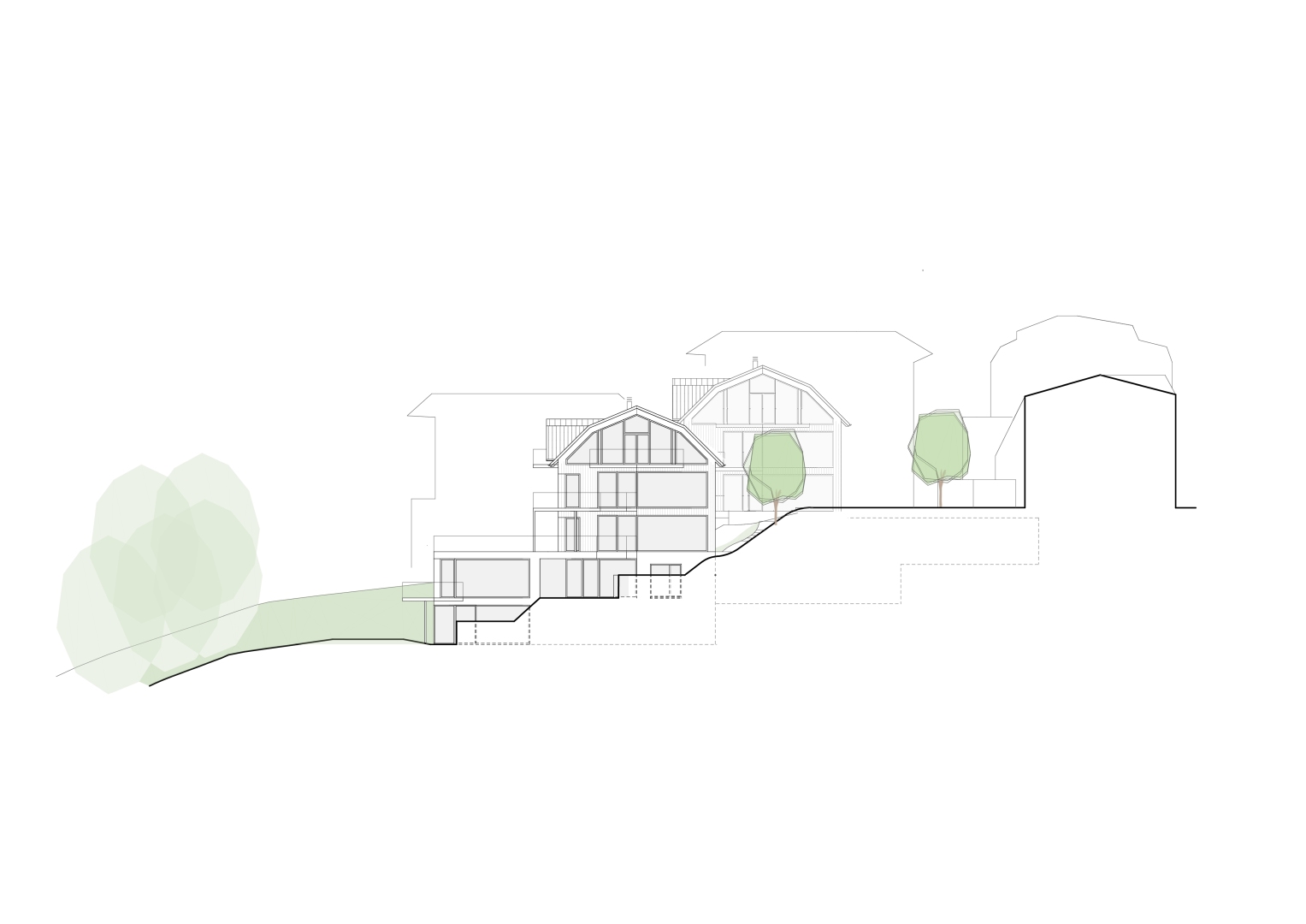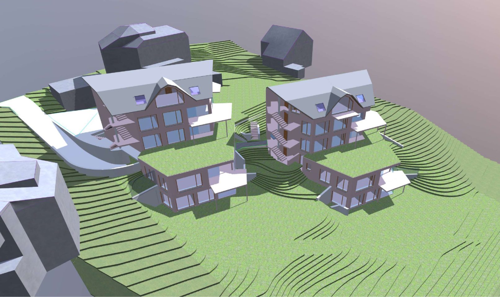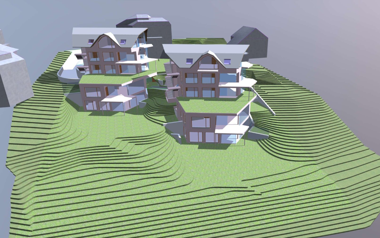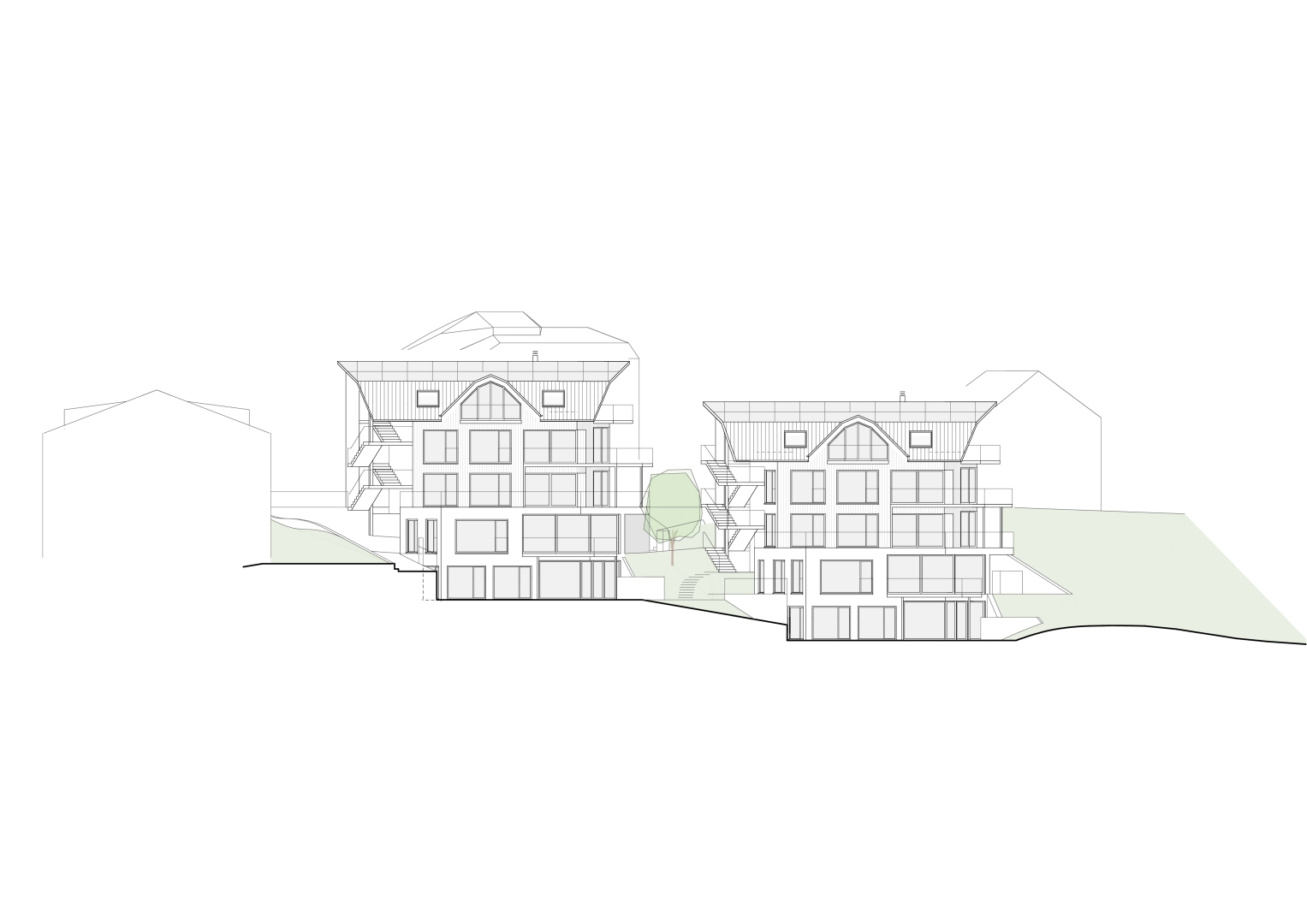 - Die neuen Gebäude sind entlang der bestehenden Höhenkurven angeordnet. Diese verlaufen tendenziell schräg zur rechteckigen Grundstücksform. Somit sind die Gebäude stark in die natürliche Topografie eingebunden. Talseitig wird der Bereich vor den Wohnungen ausgeebnet. Ansonsten werden die Terrainveränderungen und die Stützmauern auf ein Minimum beschränkt. Auf Hecken und Zäune wird gänzlich verzichtet.