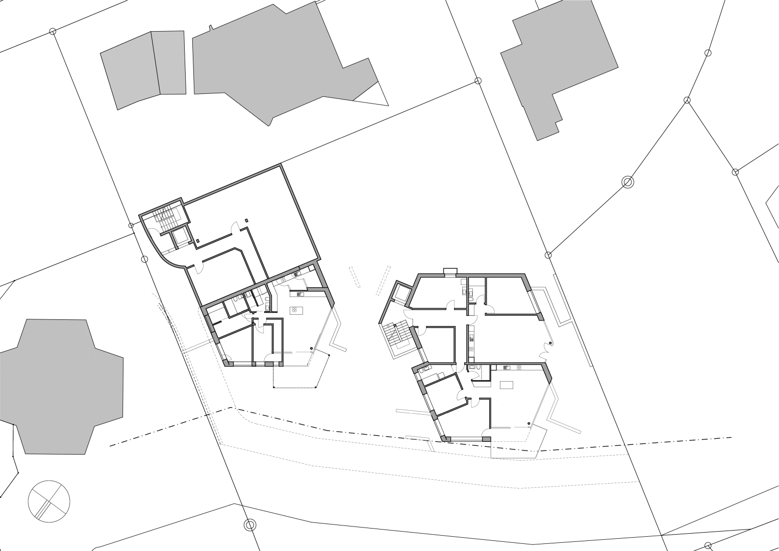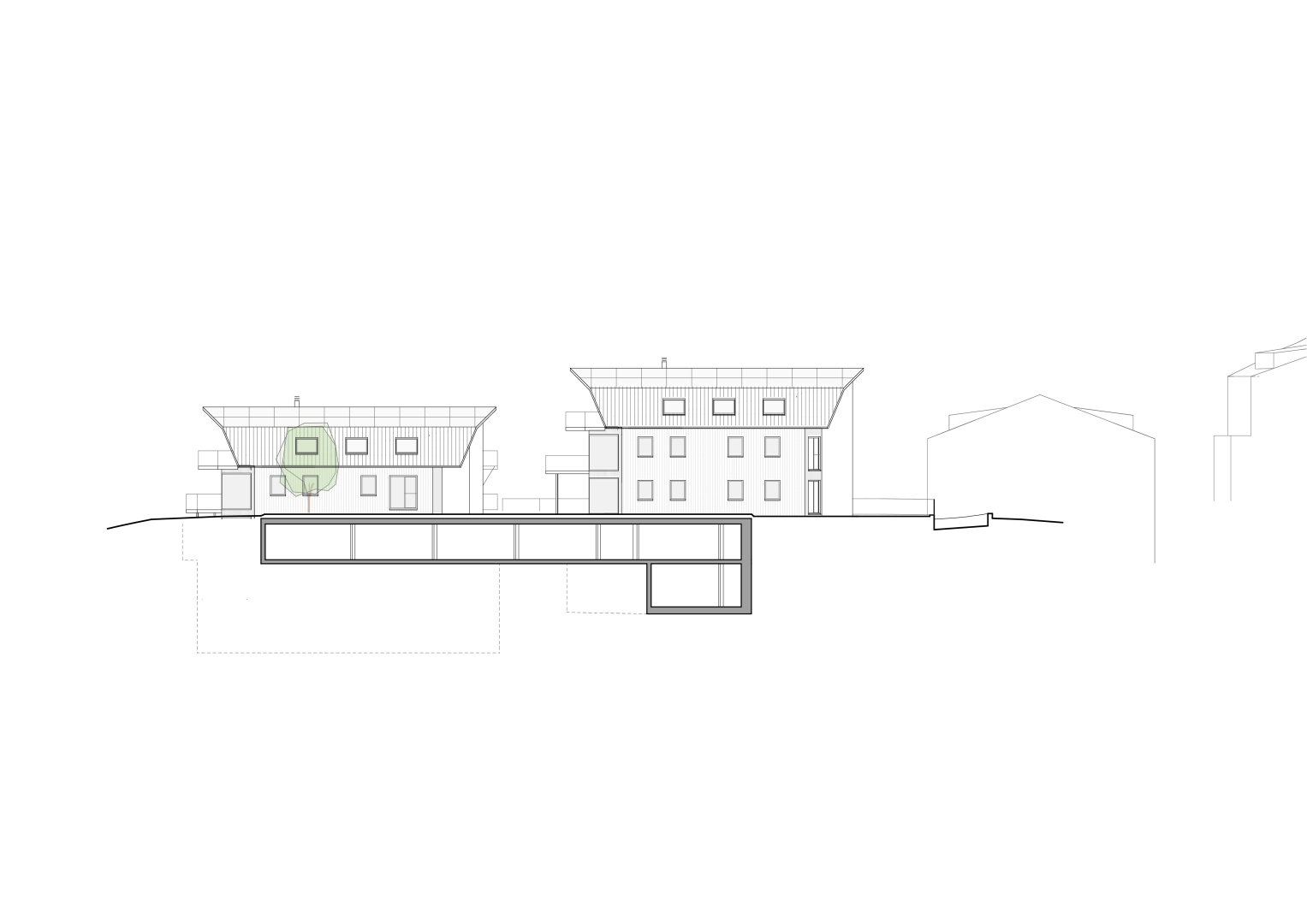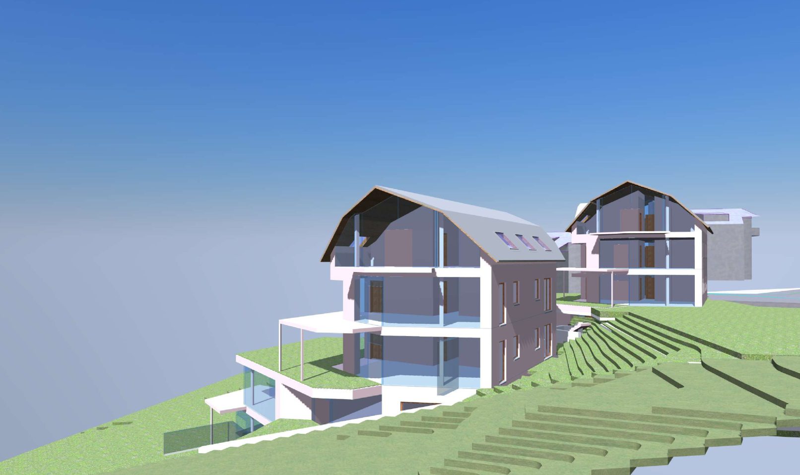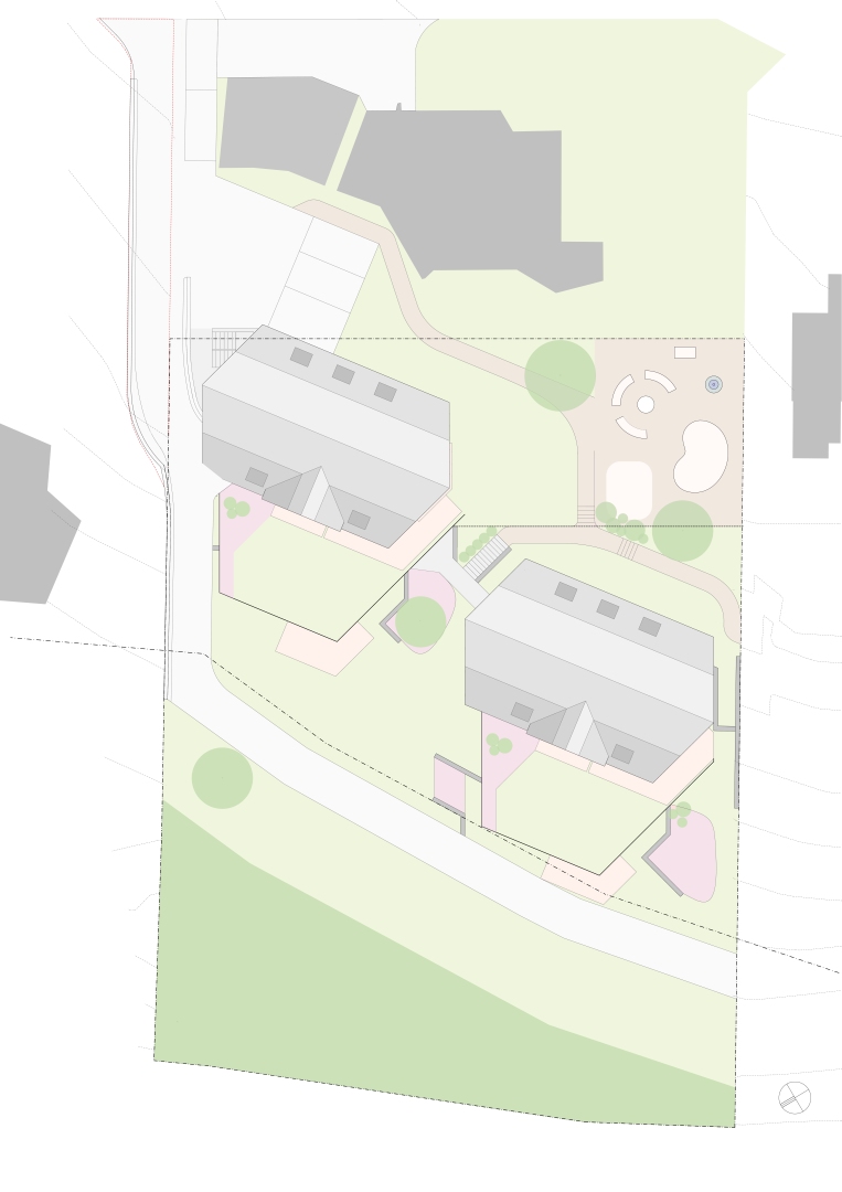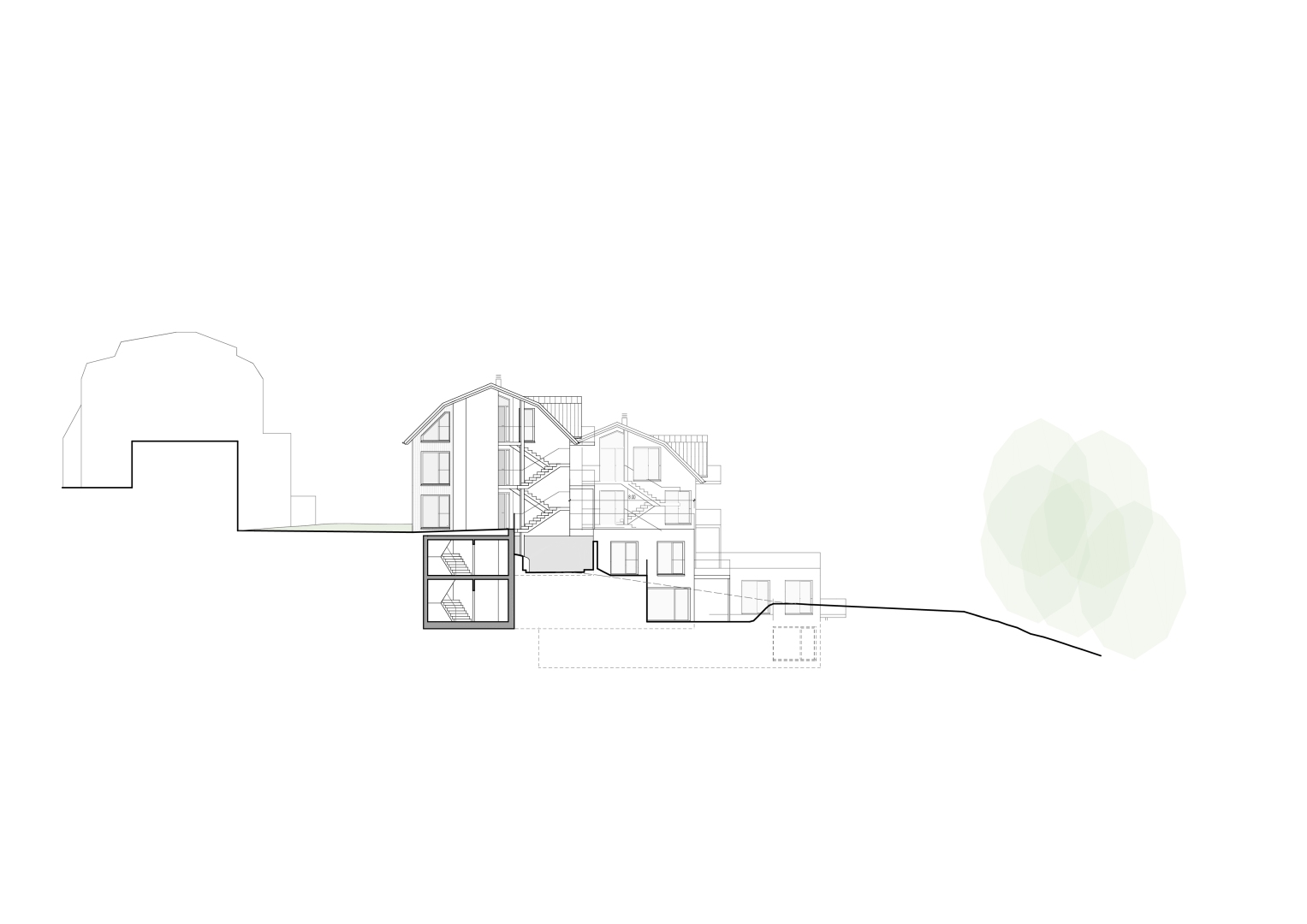 - Die neuen Gebäude sind entlang der bestehenden Höhenkurven angeordnet. Diese verlaufen tendenziell schräg zur rechteckigen Grundstücksform. Somit sind die Gebäude stark in die natürliche Topografie eingebunden. Talseitig wird der Bereich vor den Wohnungen ausgeebnet. Ansonsten werden die Terrainveränderungen und die Stützmauern auf ein Minimum beschränkt. Auf Hecken und Zäune wird gänzlich verzichtet.