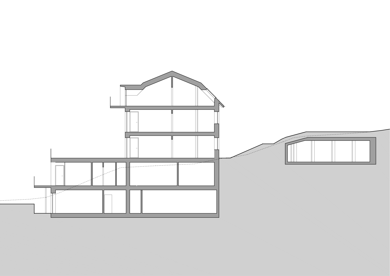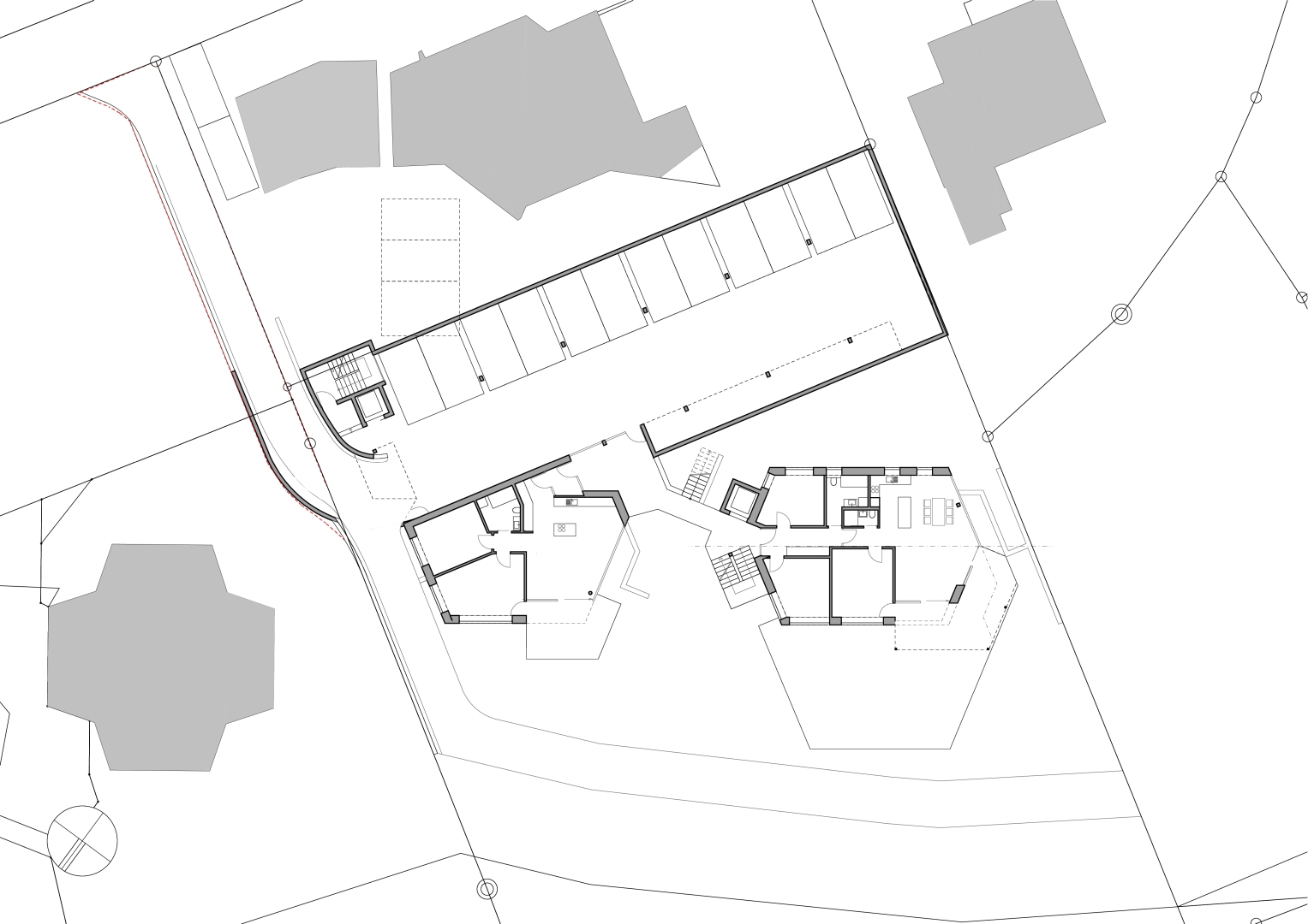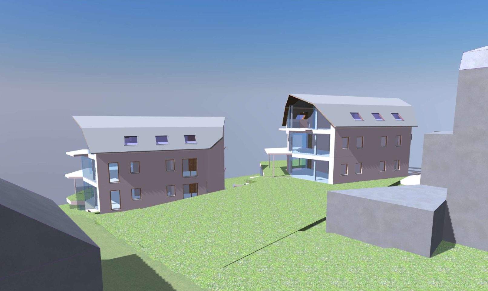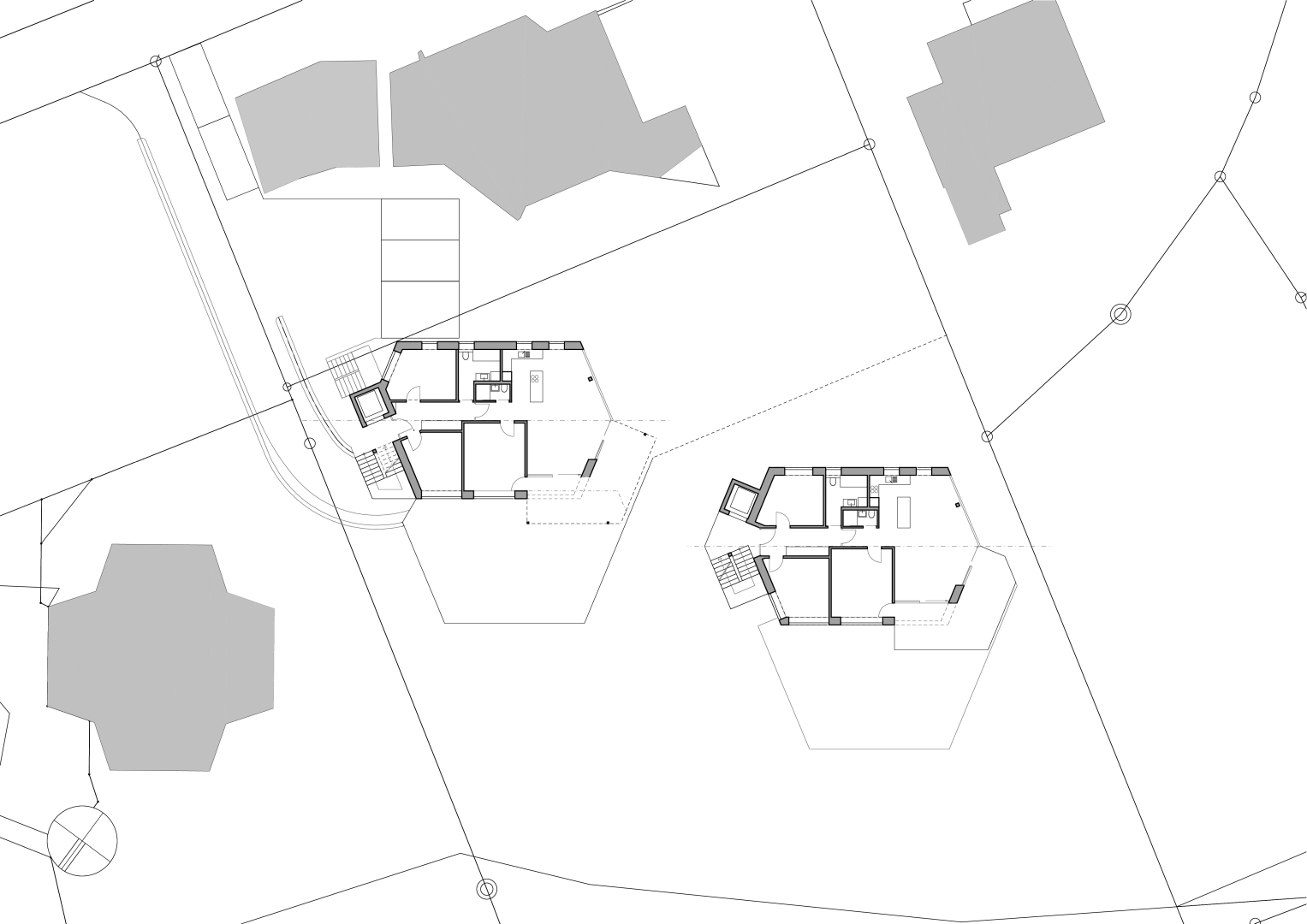- Die neuen Gebäude sind entlang der bestehenden Höhenkurven angeordnet. Diese verlaufen tendenziell schräg zur rechteckigen Grundstücksform. Somit sind die Gebäude stark in die natürliche Topografie eingebunden. Talseitig wird der Bereich vor den Wohnungen ausgeebnet. Ansonsten werden die Terrainveränderungen und die Stützmauern auf ein Minimum beschränkt. Auf Hecken und Zäune wird gänzlich verzichtet.