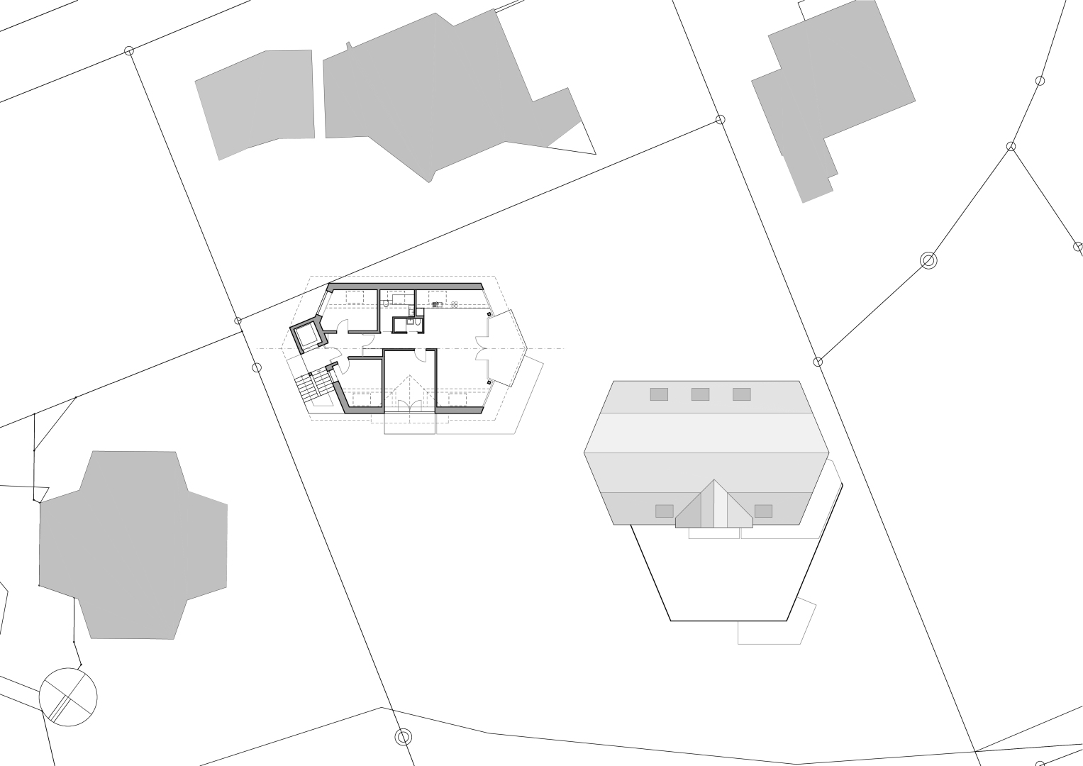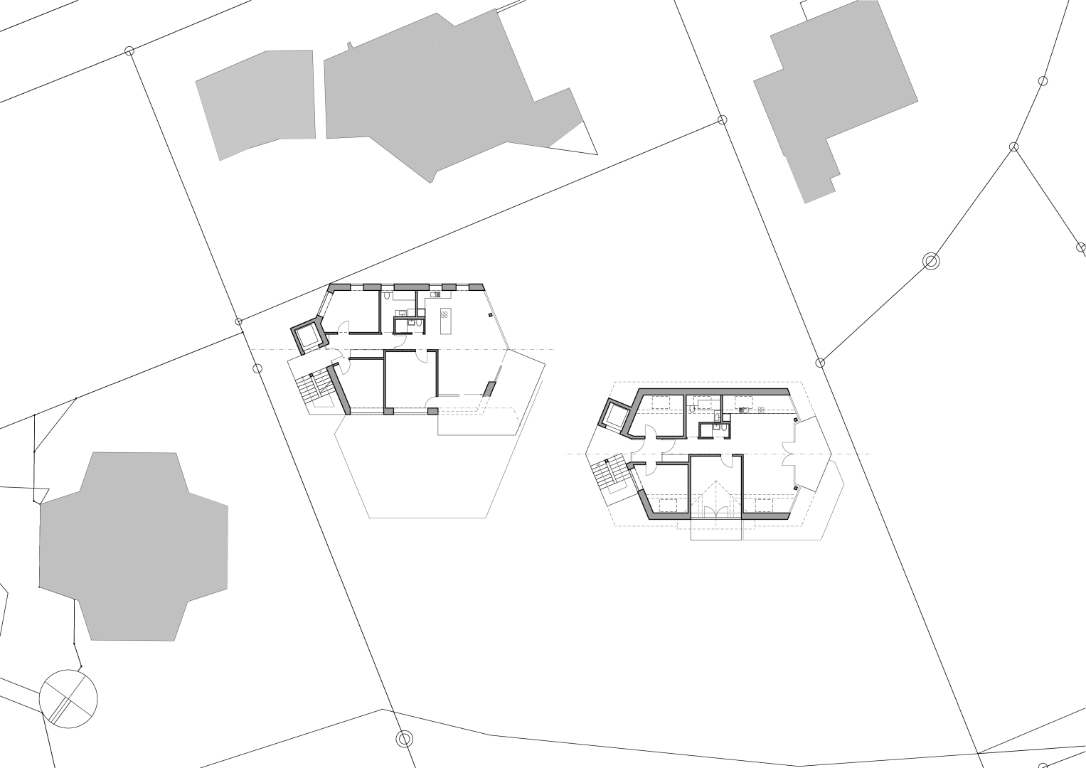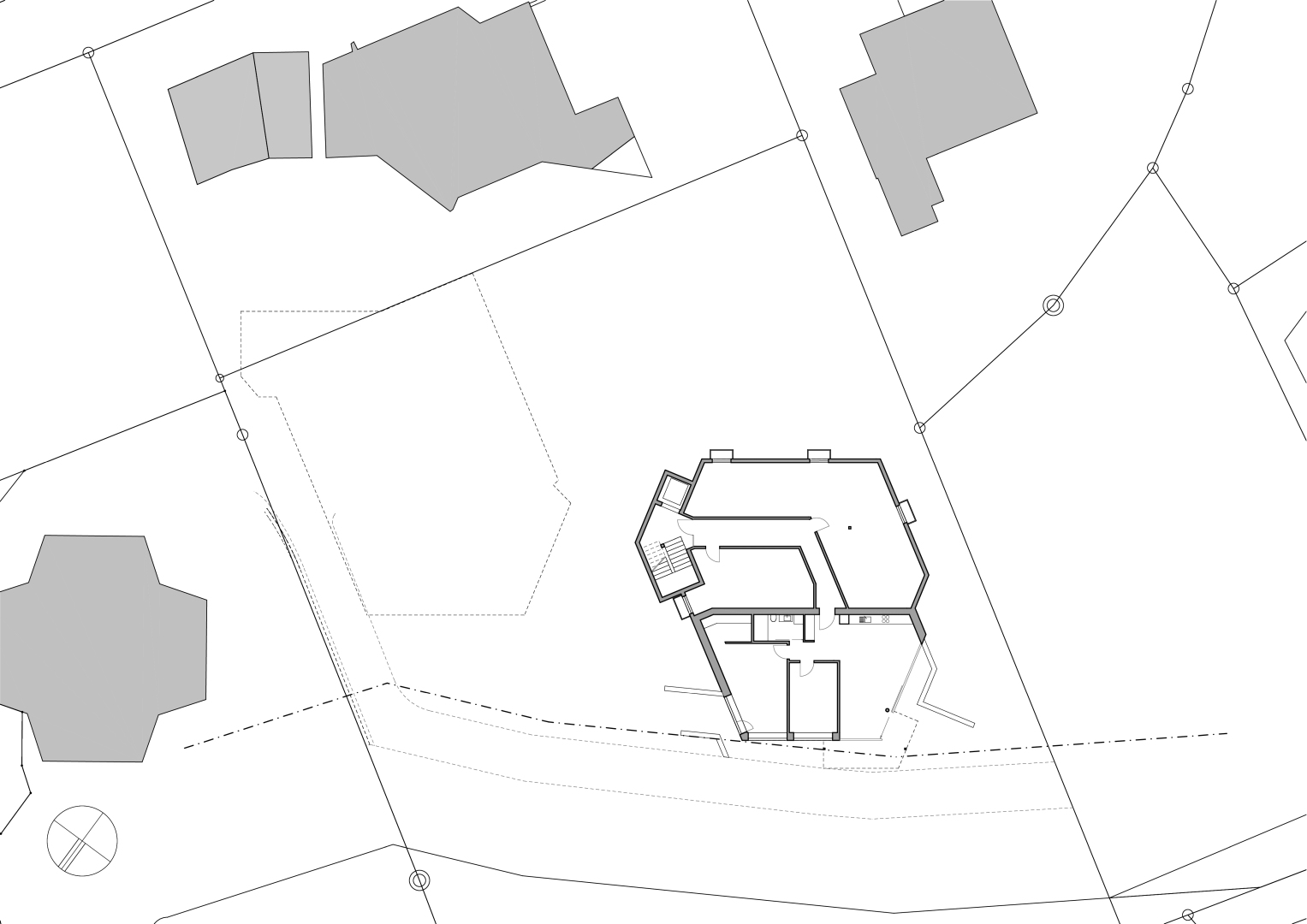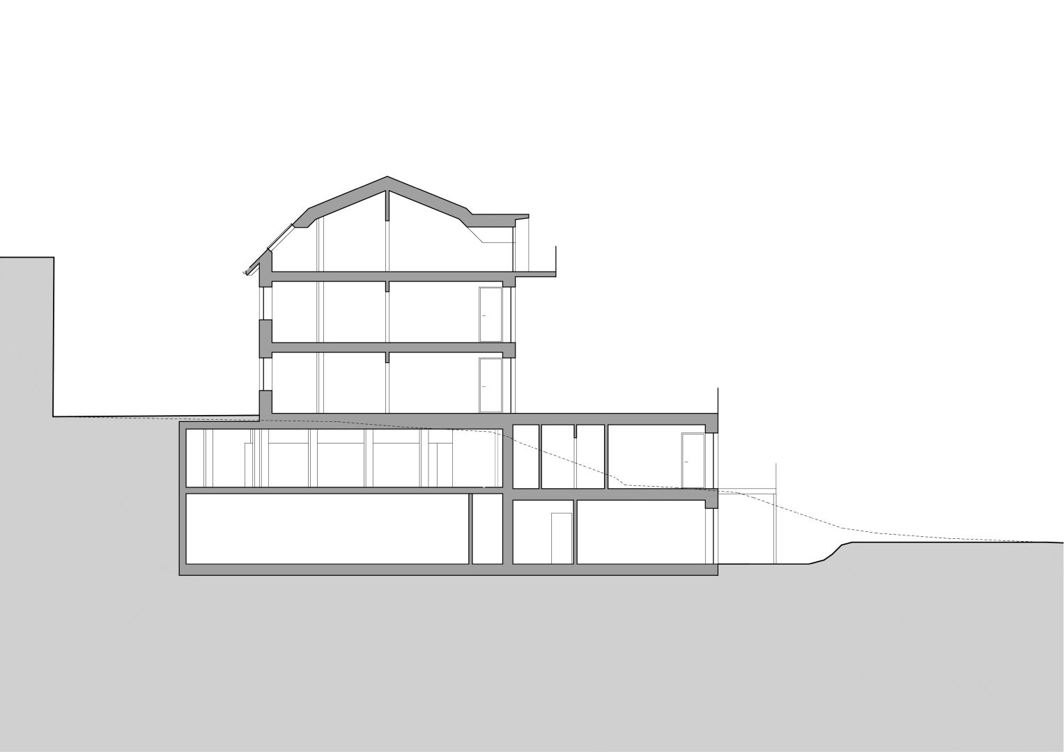 - Die neuen Gebäude sind entlang der bestehenden Höhenkurven angeordnet. Diese verlaufen tendenziell schräg zur rechteckigen Grundstücksform. Somit sind die Gebäude stark in die natürliche Topografie eingebunden. Talseitig wird der Bereich vor den Wohnungen ausgeebnet. Ansonsten werden die Terrainveränderungen und die Stützmauern auf ein Minimum beschränkt. Auf Hecken und Zäune wird gänzlich verzichtet.
